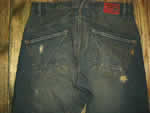 そして待つこと40分くらい 染色液の中から引っ張り出して真水でがーっと洗ってから 普通に洗剤と柔軟剤を入れて洗濯機で洗い 乾燥機にかけて完成♪ ちなみに洗剤と柔軟剤、そして乾燥機はどっちでもいいと思います。 特に乾燥機は繊維がバッチリ縮みますので 普段ジャストで穿いてるジーンズを加工する場合は 乾いてみると、穿けなくなったーってこともあり得ますので 使わない方がいいでしょう。 天日干し天日干し♪ ウチはむき出しになった横糸への風合いを考えて乾燥機に入れてますけどね^^ 【完成♪】 →![]() 左右の写真を比べてみると、白っぽかったアタリやヒゲ そして横糸が染まって、ナチュラルな風合いになってることが分かると思います 写真だといまいちですが 実物はかなりイイ感じに仕上がってますよ〜 この染めの加工を施すことによって 全体の色に対しても加工した部分が馴染みますので 非常に自然な風合いになります